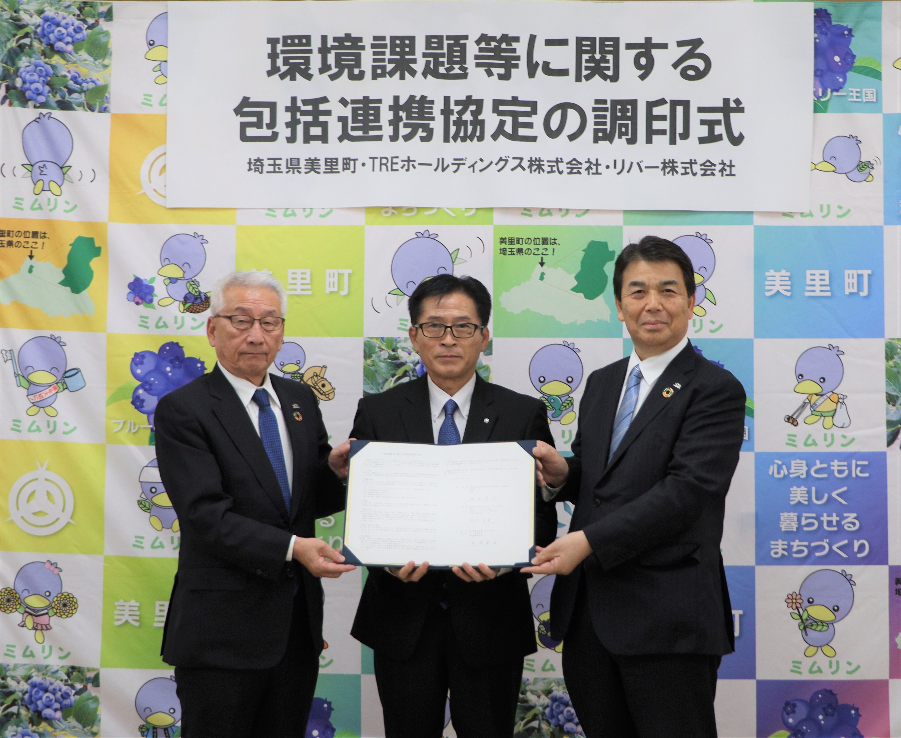 令和7年11月13日(木曜日)、埼玉県美里町・TREホールディングス株式会社・リバー株式会社と3者で環境課題等に関する包括連携協定を締結しました。