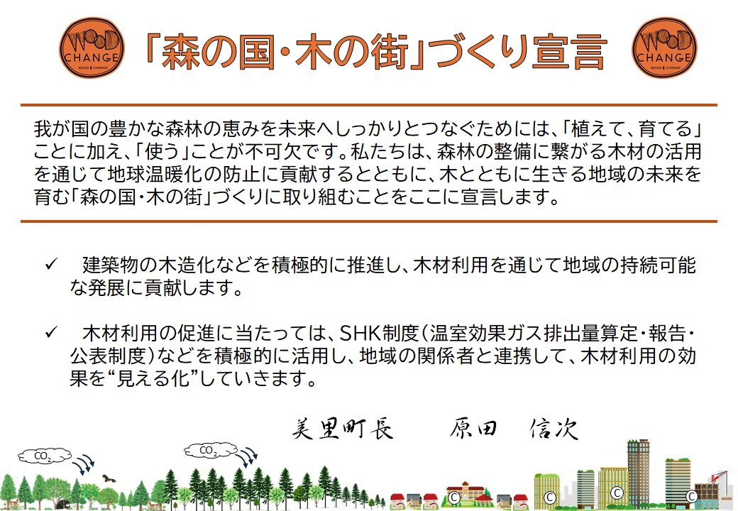 美里町は、豊かな森林資源の活用と地域活性化を目指し、木材利用の推進および木材利用の効果の見える化に取り組むため、林野庁が推進する『森の国・木の街』づくり宣言に参画しましたのでお知らせします。